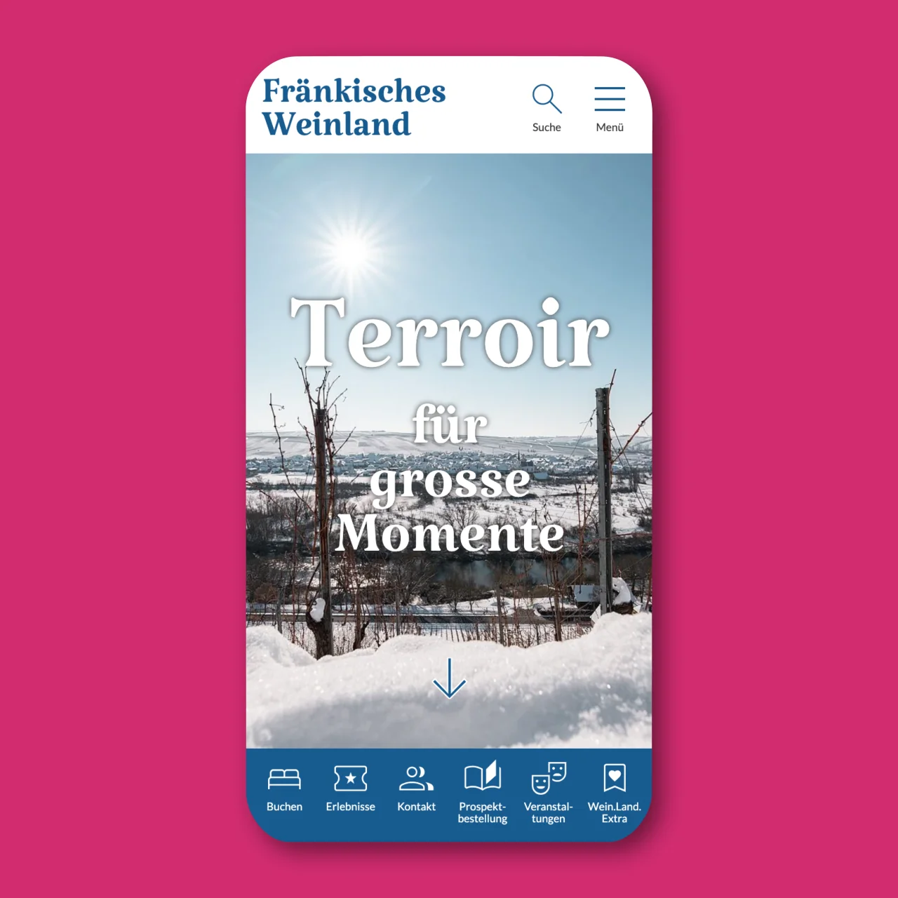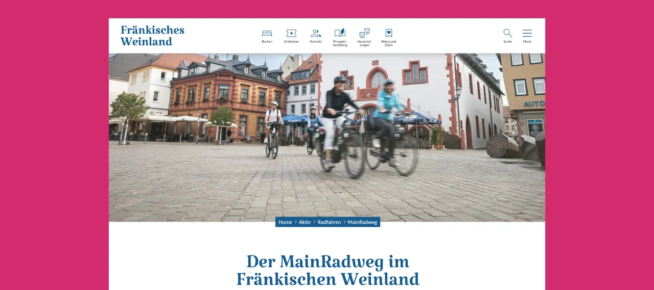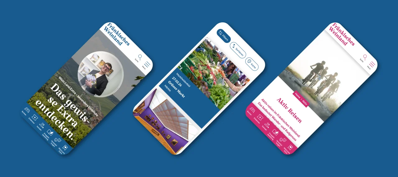 Auf einen Wein ins Web: Für den Tourismusverband Fränkisches Weinland entwickelten wir einen Webauftritt, der Genuss, Natur und Kultur digital zusammenführt. Ausdrucksstarke Bilder, eine klare Struktur und intuitive Nutzerführung verbinden Inspiration mit Optionen zur konkreten Reiseplanung.